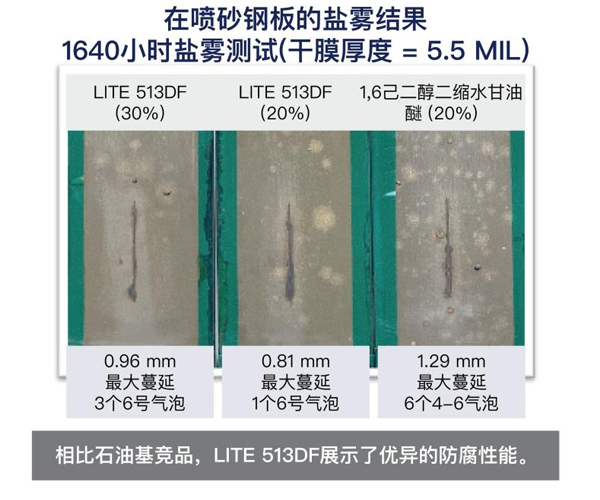 LITE 513DF是一款基于腰果殼油的新型高生物含量稀釋劑,它的環氧當量比標準的513型號要低。這款產品適用于環氧涂料、單組分和雙組分粘合劑以及復合材料。LITE 513DF粘度低,具有優異的稀釋能力,與雙酚A型液體環氧樹脂的添加重量曲線如圖所示。作為稀釋劑,它在環境溫度和低溫下具有良好的硬度發展。與其他腰果殼油改性的材料類似,LITE 513DF具有良好的耐水性和柔韌性。在涂料應用中,LITE 513DF在長期鹽霧試驗中表現出非常好的防腐性能,請見本頁面板的圖片。在粘合劑應用中,這種環氧稀釋劑還可作為改性劑,提高伸長率和粘結強度,同時將對Tg和抗拉強度的影響降至低。